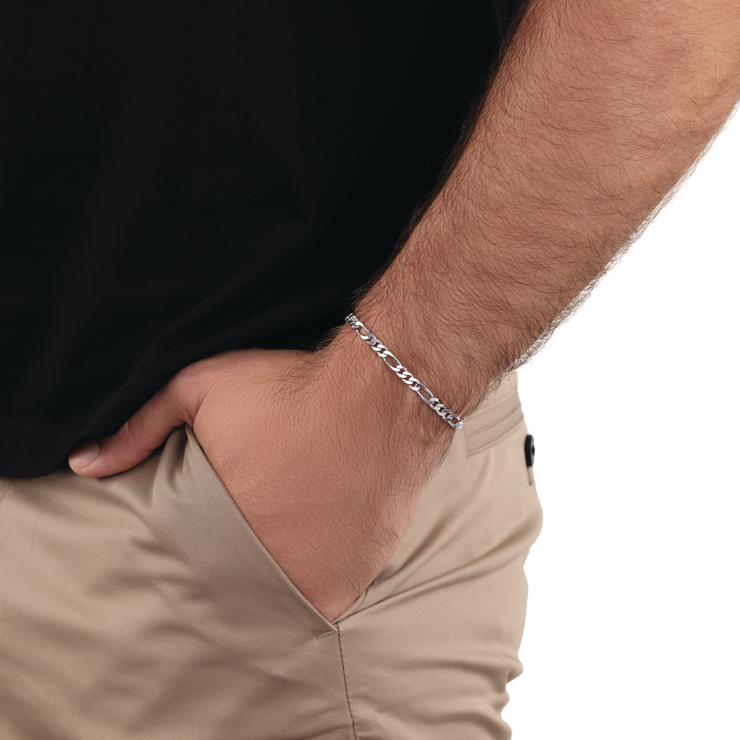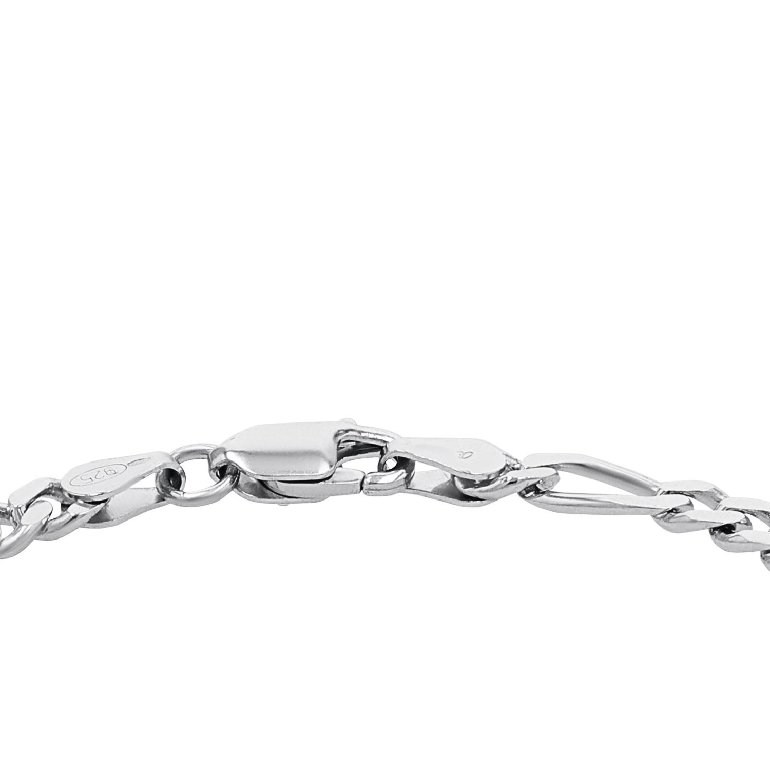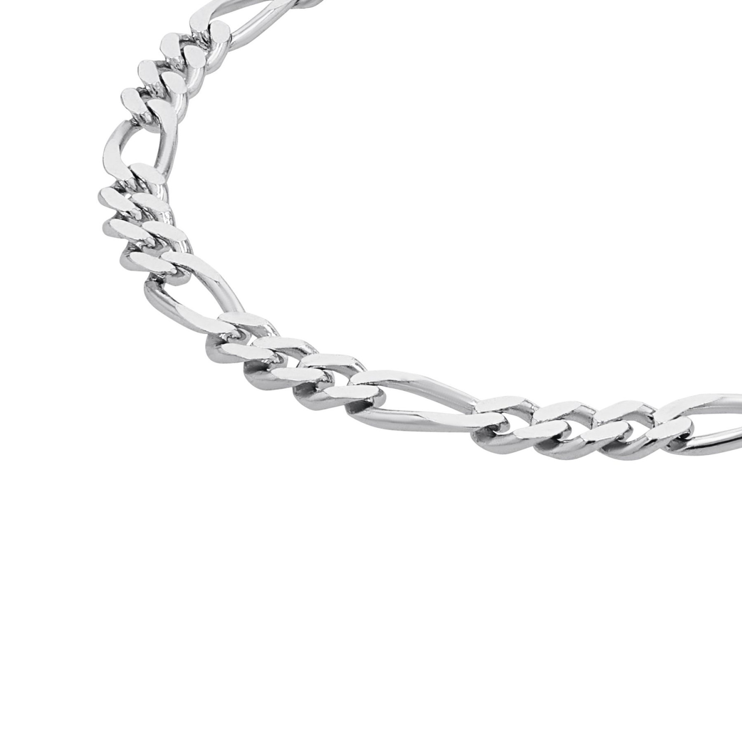 Hier präsentiert sich eine schlichte und dadurch wunderbar kombinierbare Armkette aus 925 Sterling Silber. Das hochwertig verarbeitete Schmuckstück besteht aus Figaro Gliedern und ist 19cm lang. Durch einen praktischen Karabinerverschluss lässt sich das Armband sicher schließen.