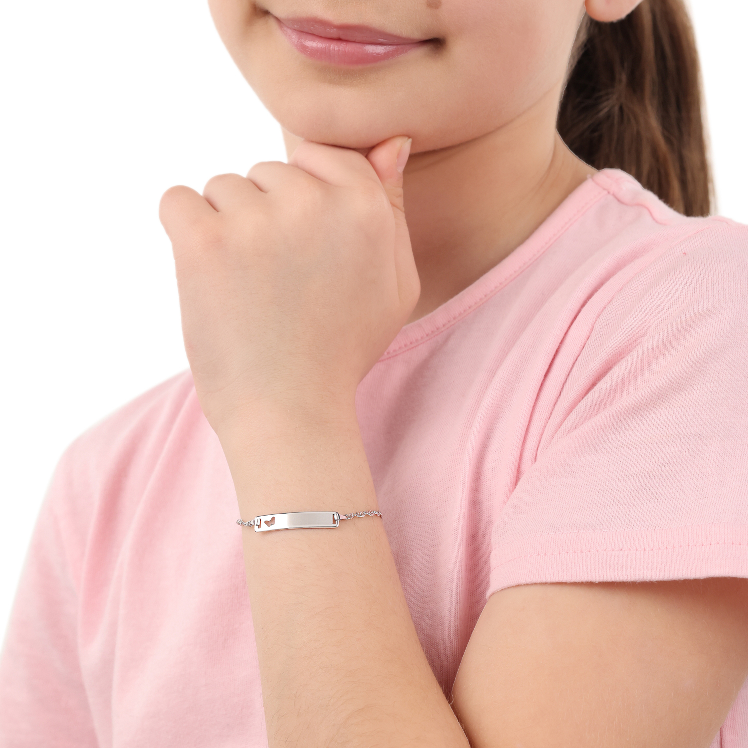 Gravierbare Ident Armbänder sind schon lange ein Trendthema bei kleinen Mädchen! Ein besonders schönes Modell ist dieses Armband aus der Prinzessin Lillifee Echtschmuck Kollektion mit einem ausgestanzten Schmetterling als Highlight. Die Identplatte kann je nach Belieben mit einer persönlichen Gravur versehen werden.
